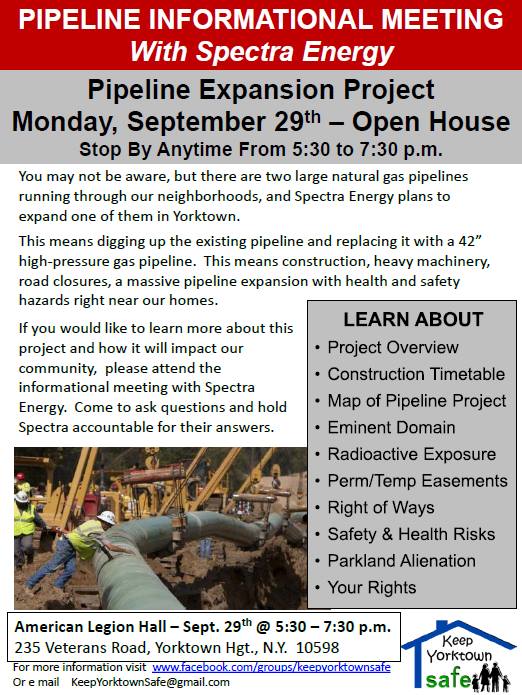 Please attend the Informational meeting about the Atlantic Bridge project and how, along with the Algonquin (AIM) project, it wil impact our community in Yorktown. This is coming through your neighborhood and parks. Be informed. Show up and ask questions.