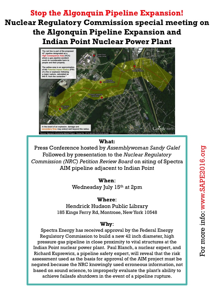 Representatives from the Nuclear Regulatory Commission (NRC), Entergy Indian Point (IPEC), Spectra Energy, New York State and the Pipeline Hazards Materials Safety Agency (PHMSA) are also invited to provide their positions on this very controversial topic of locating high pressure gas lines adjacent to operating nuclear power plants