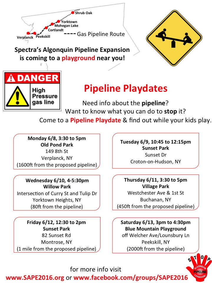 Susan Rubin has planned this event to coincide with the Westchester County annual emergency drill that will be going on the same day. The Spectra AIM pipeline project is a public health and safety emergency! The lives of 20 million people are at stake because of the unacceptable siting of the 42″ diameter high pressure pipeline adjacent to Indian Point. Two compressor station expansions in New York will subject our population to an increase in toxic emissions. Pipelines leak methane, CO2, VOC’s and other chemicals and pipelines explode.